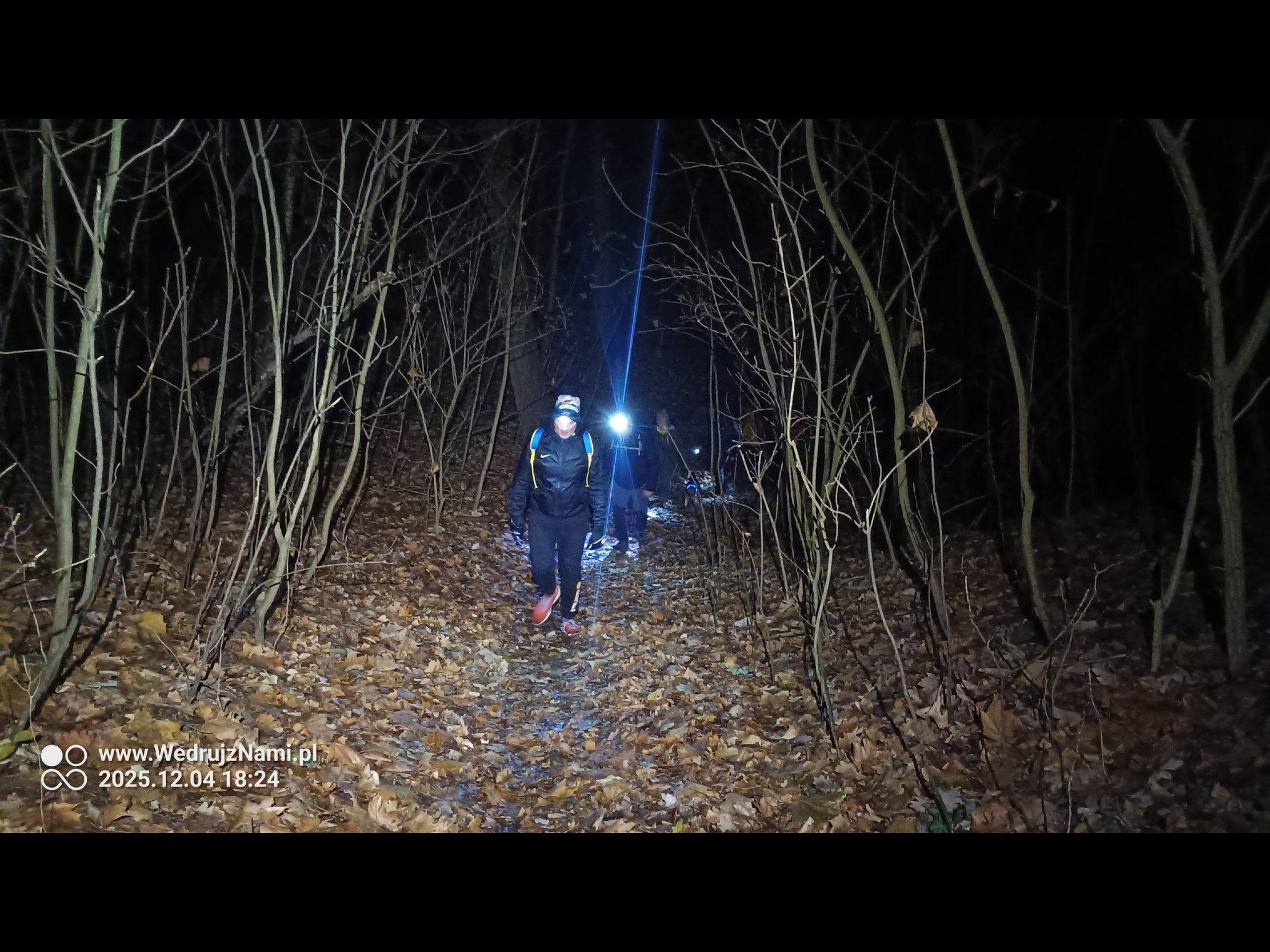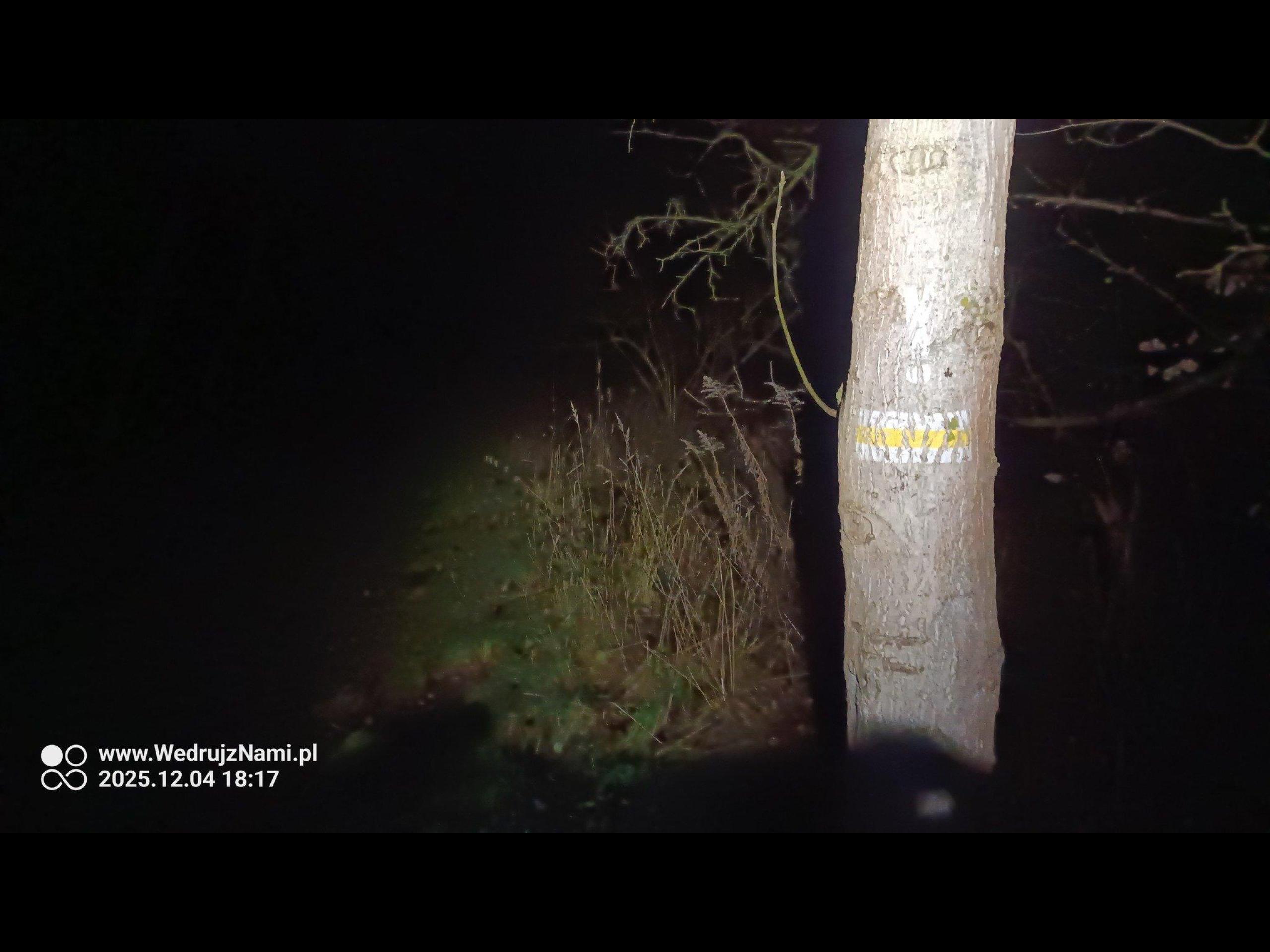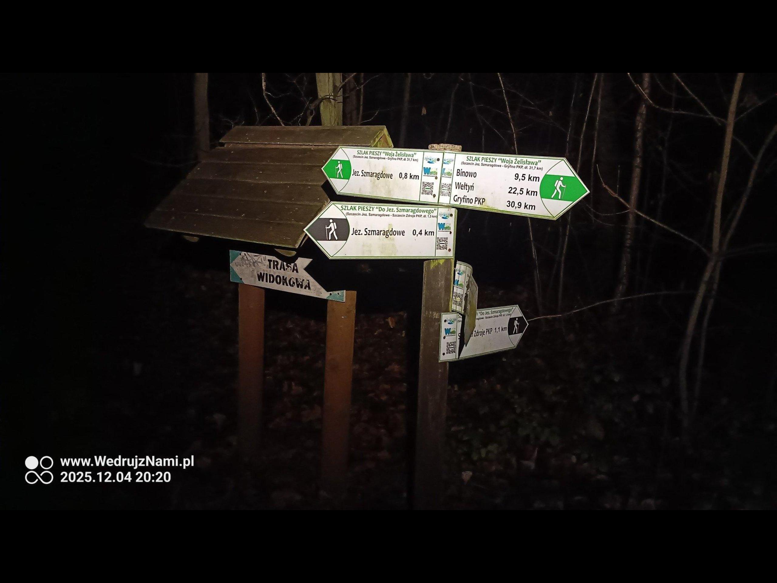 Naszą wyprawę rozpoczęliśmy żółtym szlakiem pieszym "Do Szwedzkiego Kamienia" - https://wedrujznami.pl/P-Y-ZS/ZGR-058 . Dotarliśmy pod dużą górę. Jednak z powodu mokrej glinki z piaskiem, nie zdecydowaliśmy się wchodzić pod wysokim kątem, na sam szczyt wzniesienia, i poszliśmy okrężną drogą, z mniej stromym podejściem. I tak po kilkunastu minutach, zaliczyliśmy pierwszy punkt widokowy na trasie. Umiejscowiony jest na dawnej hałdzie pokopalnianej - wzgórze Widok 51 m.n.p.m.. Tutaj zrobiliśmy krótki odpoczynek, podziwiając Szczecin nocą. W dzień, rozpościera się z niego, ładny widok na rozlewiska Odry. Więc polecam się tam wybrać. Po odpoczynku żółtym szlakiem, po kilku podejściach doszliśmy do rezerwatu przyrody "Zdroje" (cisy). Tutaj kawałek bez szlaku, wędrowaliśmy wzdłuż skarpy po starej kopalni, w kierunku jeziora Szmaragdowe. Przy Armatnim Wzgórzu skręciliśmy w lewo, wchodząc na drugi żółty szlak pieszy "Familijny" - https://wedrujznami.pl/P-Y-ZS-052 . W nocy nie widać nic w tym miejscu. Jednak historycznie było tu stanowisko ogniowe niemieckiej artylerii broniącej w 1945 r. dojścia do Odry. Do 1955 roku stało tu działo, mające doskonałe pole ostrzału w kierunku wschodnim i południowo-wschodnim. Jeszcze wtedy był piękny widok z tego miejsca. Obecnie zasłoniły go rozrastające się drzewa, a stanowisko zostało silnie rozmyte i zatarte.